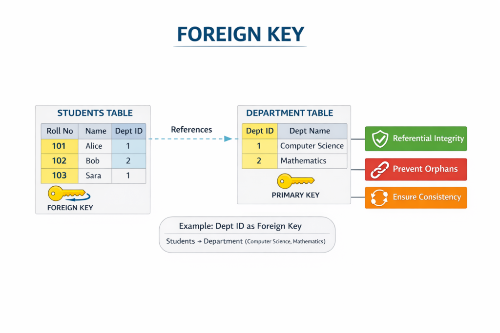 A foreign key is a column in one table that refers to the primary key of another table. It is mainly used to create relationships between two tables. For example, a student table may have a department ID that refers to the department table. Foreign keys help maintain referential integrity, ensuring that invalid data is not entered. They prevent orphan records and keep data consistent across tables. Interviewers include this topic in interview questions in the database management system to test understanding of table relationships.