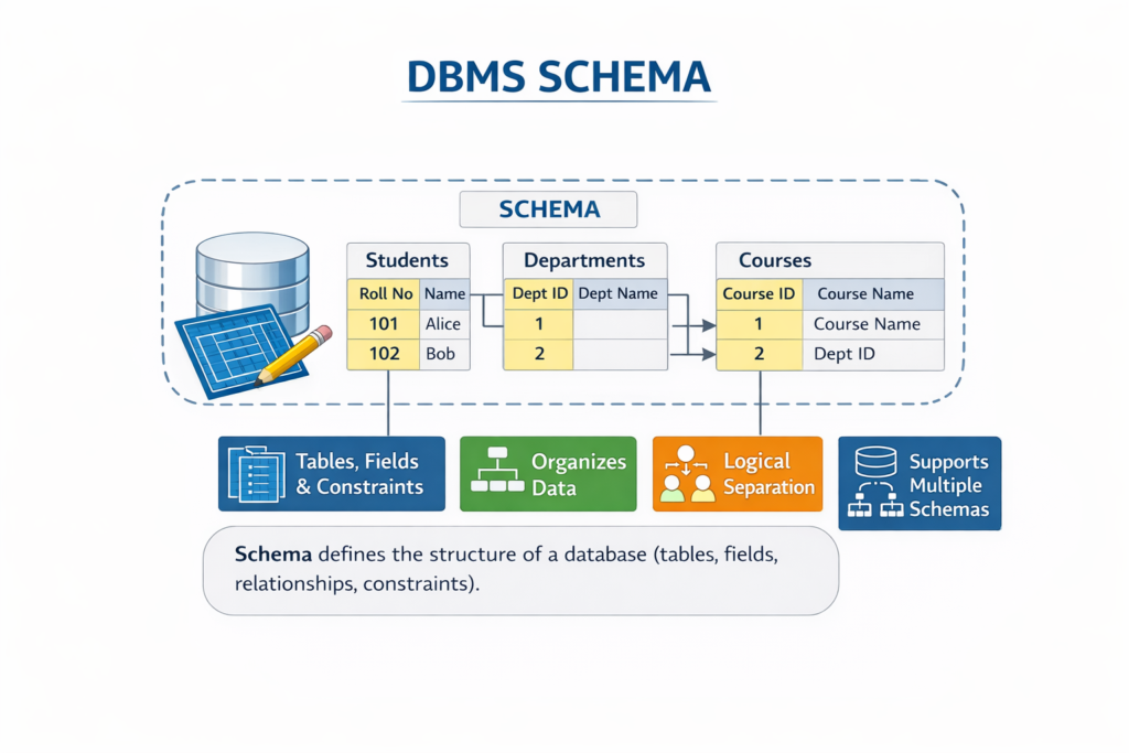 A schema defines the structure of a database, including tables, fields, relationships, and constraints. It acts as a blueprint of the database. A schema helps users understand how data is organized. It also provides logical separation between different users. DBMS supports multiple schemas in one database. This question is commonly asked in database management system interview questions and answers to check design-level understanding.