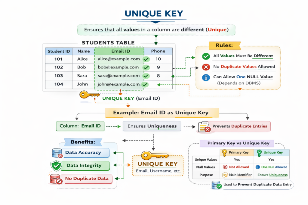 A unique key ensures that all values in a column are different from each other. Unlike a primary key, a unique key can allow one null value depending on the database system. It helps prevent duplicate data entry. For example, an email ID is usually defined as a unique key. Unique keys improve data accuracy and integrity. This concept is frequently asked in interview questions in database management systems because uniqueness is a major requirement in real-world applications.