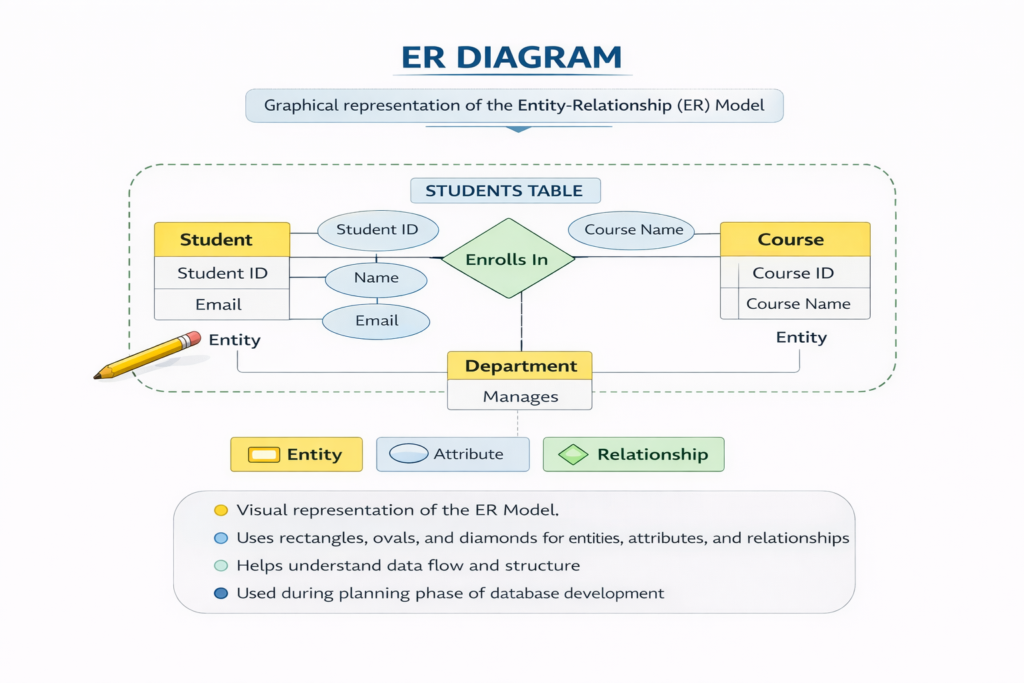 An ER diagram is a graphical representation of the ER model. It uses rectangles for entities, ovals for attributes, and diamonds for relationships. ER diagrams help in understanding data flow and structure easily. They are used during the planning phase of database development. ER diagrams reduce errors and improve clarity. Interviewers frequently ask about ER diagrams in interview questions in database management systems.