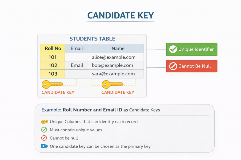 A candidate key is a column or a group of columns that can uniquely identify each record in a table. In a table, there can be multiple candidate keys, but only one of them is chosen as the primary key. For example, in a student table, both roll number and email ID can uniquely identify a student. Therefore, both are candidate keys. Candidate keys must contain unique values and cannot be null. Understanding candidate keys is important because they help database designers decide the best primary key. This concept is often included in database management system interview questions and answers to test basic database design knowledge.