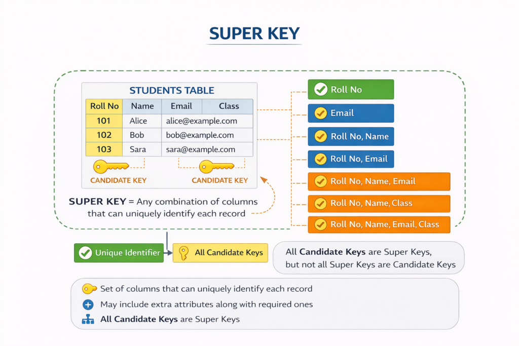 A super key is any set of one or more attributes that can uniquely identify a record in a table. It may contain extra attributes along with the required ones. For example, a combination of roll number and student name can be a super key, even though roll number alone is sufficient. All candidate keys are super keys, but not all super keys are candidate keys. Super keys help in understanding uniqueness within a table. Interviewers often ask this question in interview questions in a database management system to check whether candidates understand the hierarchy of keys clearly.