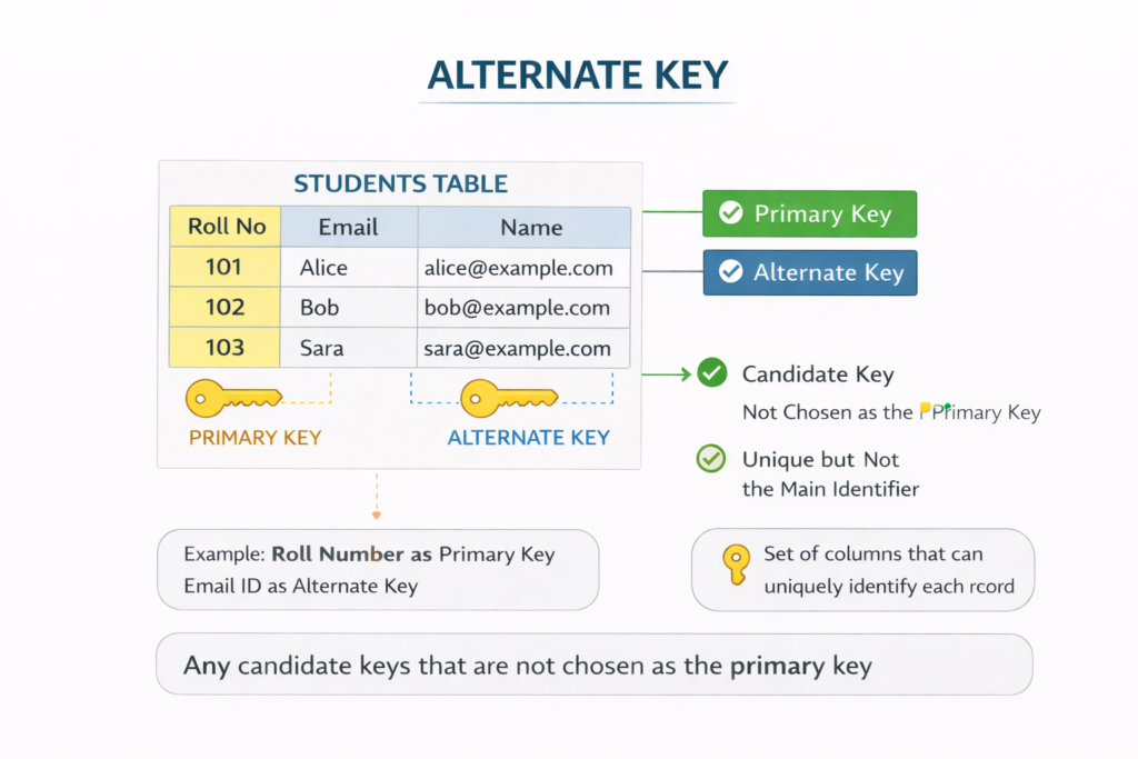 An alternate key is a candidate key that is not selected as the primary key. Since a table can have multiple candidate keys, one is chosen as the primary key, and the remaining candidate keys become alternate keys. For example, if the roll number is selected as the primary key, then the email ID becomes an alternate key. Alternate keys still maintain uniqueness but are not used as the main identifier. This concept is important in database design and commonly appears in database management system interview questions for freshers.