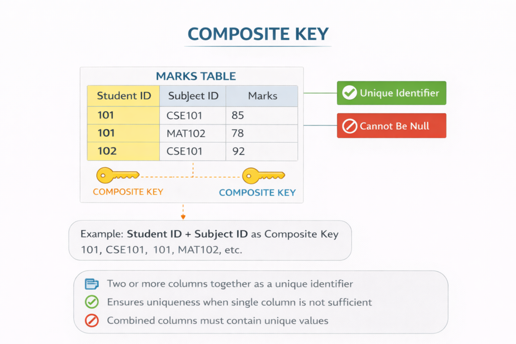 A composite key is a key made using two or more columns together to uniquely identify a record. It is used when a single column is not enough to ensure uniqueness. For example, in a marks table, student ID and subject ID together can form a composite key. Individually, they may repeat, but together they remain unique. Composite keys are very useful in relational databases. Interviewers include this topic in database management system interview questions and answers to test understanding of multi-attribute uniqueness.